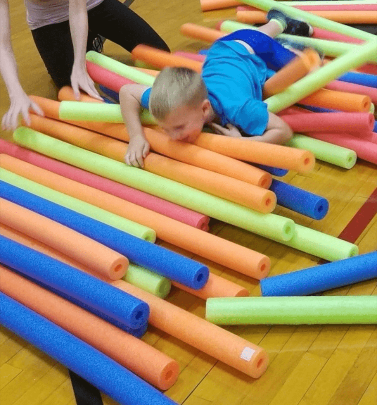 There are countless activities with my classes to keep your kids engaged, learning and challenging their bodies AND their minds. Your children will learn to work as a team as we help each other through the Hot Lava Obstacle Course. They will build muscle as they balance on a block and hand the large ball from friend to friend. They will encourage their teammates as they crab walk around the cones and race back. And there never needs to be down time! If friends are waiting for Noodle Mountain, we balance on one foot or do some jumping jacks.